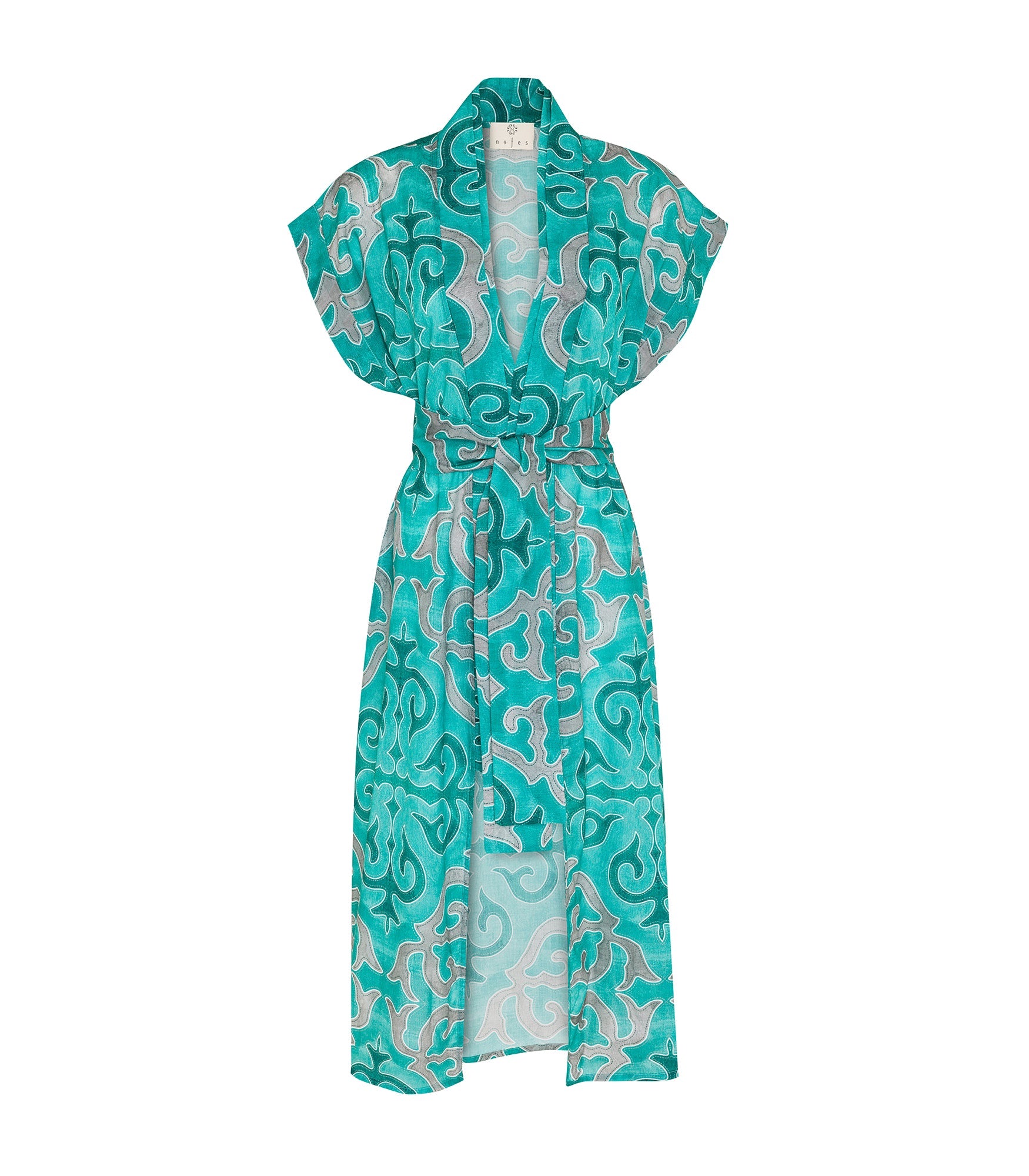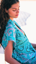 The silhouette is intentionally relaxed—cinched at the waist with a matching belt to flatter the figure while allowing the fabric to cascade with ease. Wide, draped sleeves and an open front neckline offers a graceful layering piece that floats effortlessly over swimwear or resort ensembles.