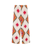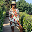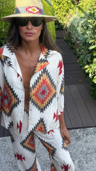 A relaxed fit button-up shirt adorned with an Aztek print evoking the artistry of boho summer days.
