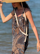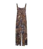 Sleeveless wide-leg jumpsuit, crafted in a bold tropical leaf print that blends earthy brown tones with deep charcoal and crisp white accents. Designed for both comfort and style, it’s the perfect statement piece for summer days and balmy evenings.