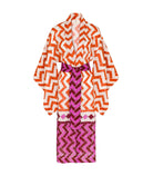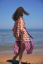 Turn heads with effortless elegance in this stunning violet kimono kaftan. Featuring an intricate all-over print in complementary shades of orange and pink, this statement piece is designed to elevate your resort wardrobe.