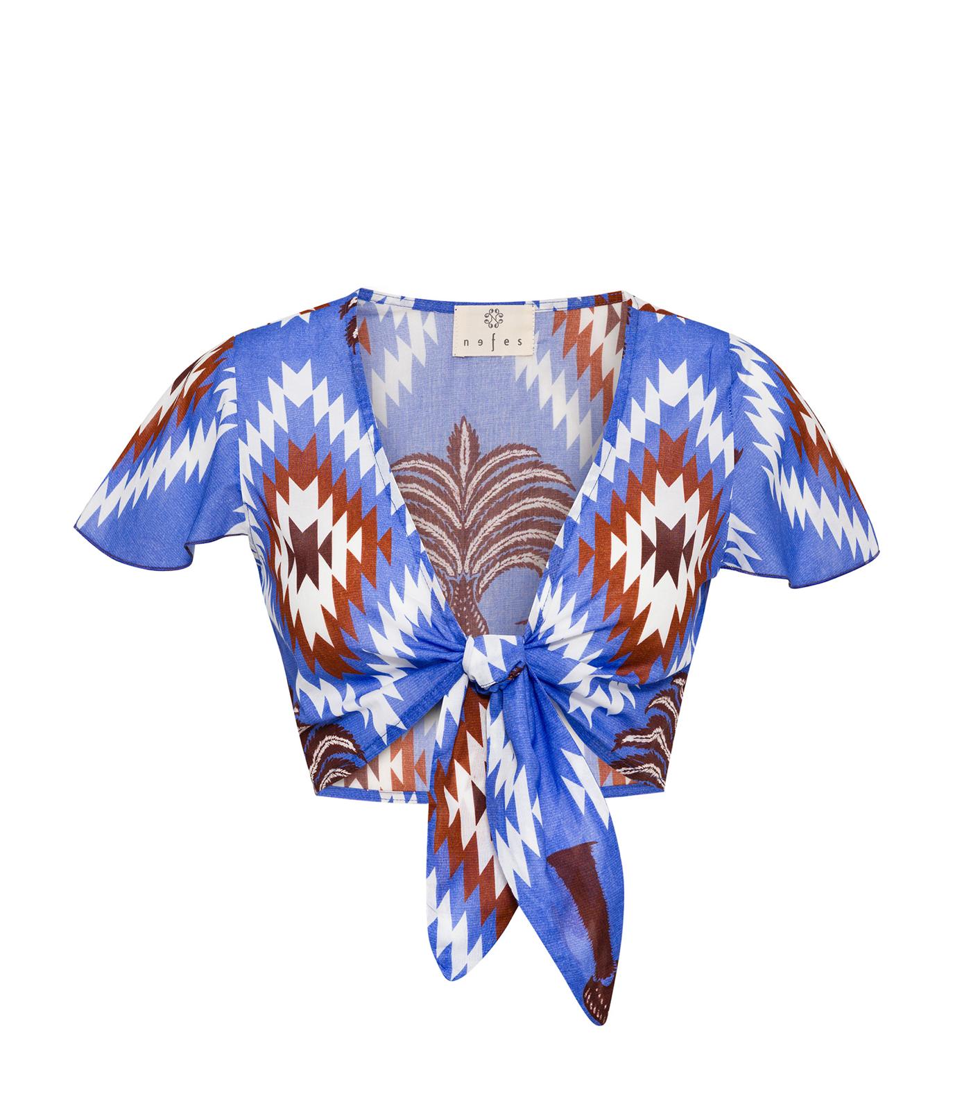The vibrant geometric and palm-inspired print in shades of blue, white, and brown gives the piece a bold yet elegant summer character. Lightweight and breathable, it’s ideal for sunny days, seaside dinners, or relaxed city outings.