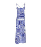 Featuring a relaxed, loose fit silhouette and thin, adjustable straps that tie delicately at the back, this piece combines comfort and versatility with subtle sensuality. The eye-catching Markuteri print in bold ink in blue tones lends a touch of boho charm, while the full-length design adds grace and femininity to every step.