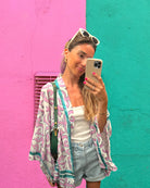 One size fits all, loose fit, matching fabric belt , hip-length, 100% organic cotton fabric, made in Turkey.