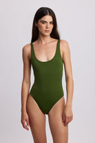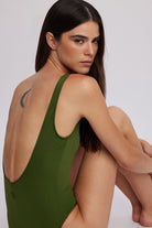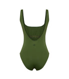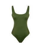 Timeless and basic one-piece swimsuit matching with Nefes kaftans has broad straps and a round neckline.