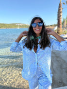 The bold aztek palm print in warm, earthy tones is designed to make a statement—whether worn solo or as a set with the coordinating trousers. Lightweight and breathable, it's the perfect piece for resort getaways, casual brunches, or sunny days in the city.