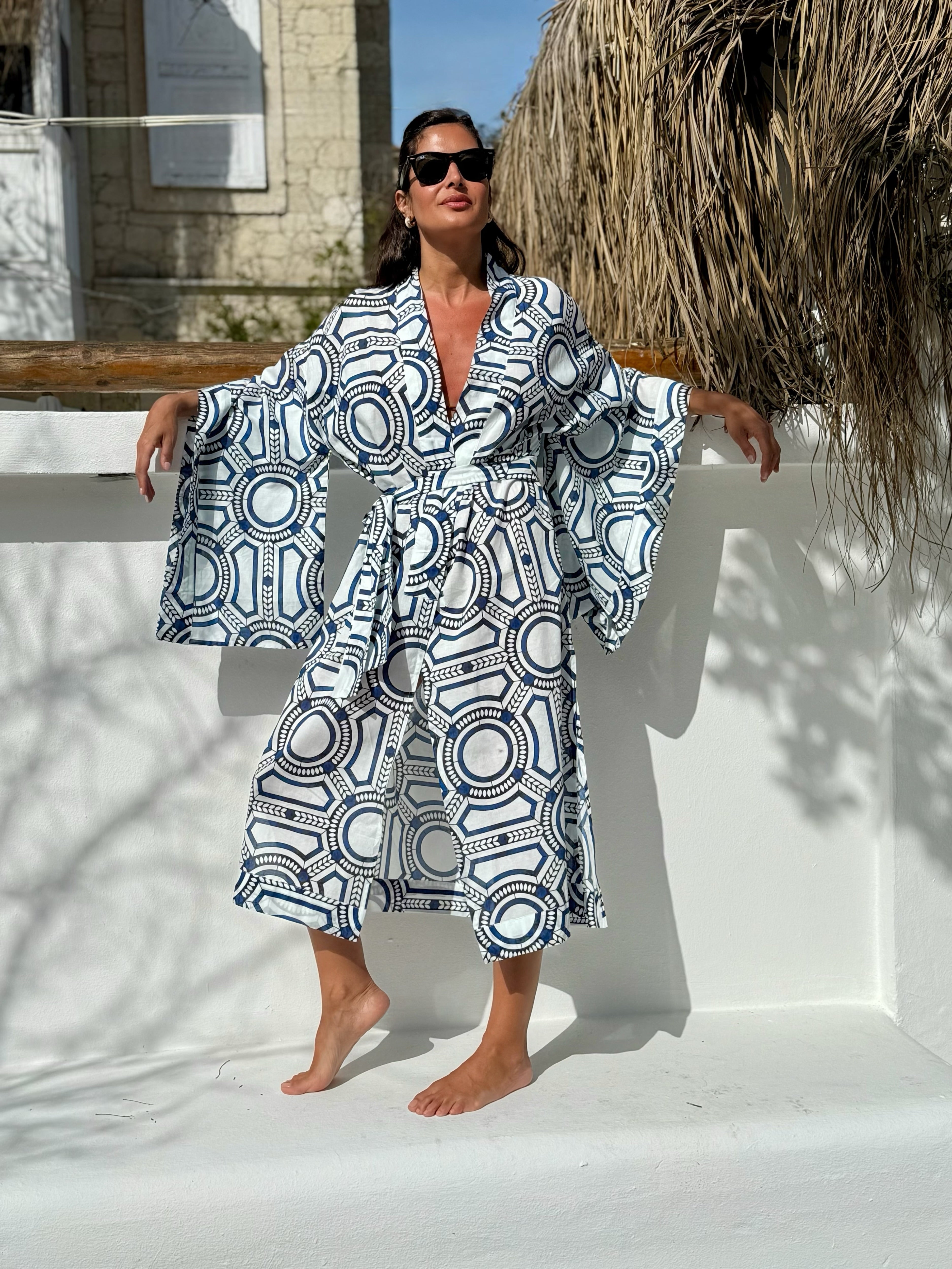 One size fits all, loose fit, matching fabric belt , long length, 100% organic cotton fabric, made in Turkey.